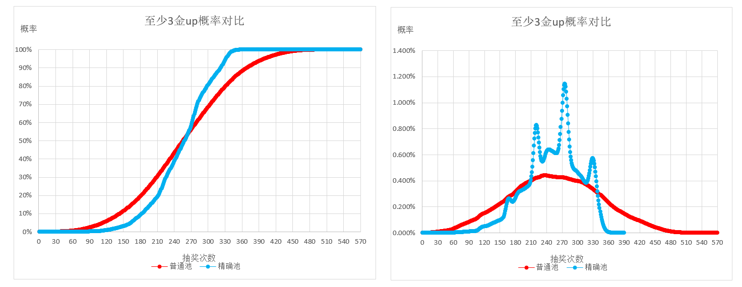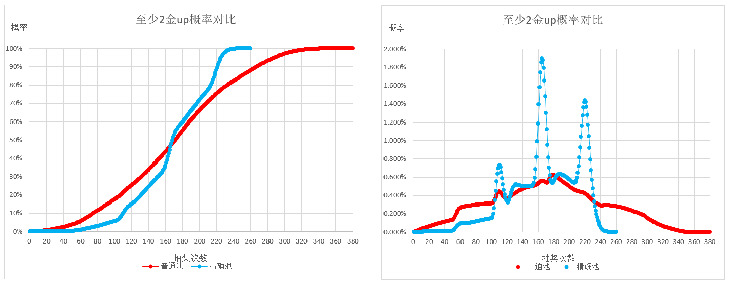 结论4:对于多up抽取,期望值对应的概率一般在50%附近。如果想50%以上概率出指定数量金up数量,建议选精确池并准备足够抽数,抽数不足反而普通池更优。以下按大小保底状态均为0举例对比,其他情况可自行计算。