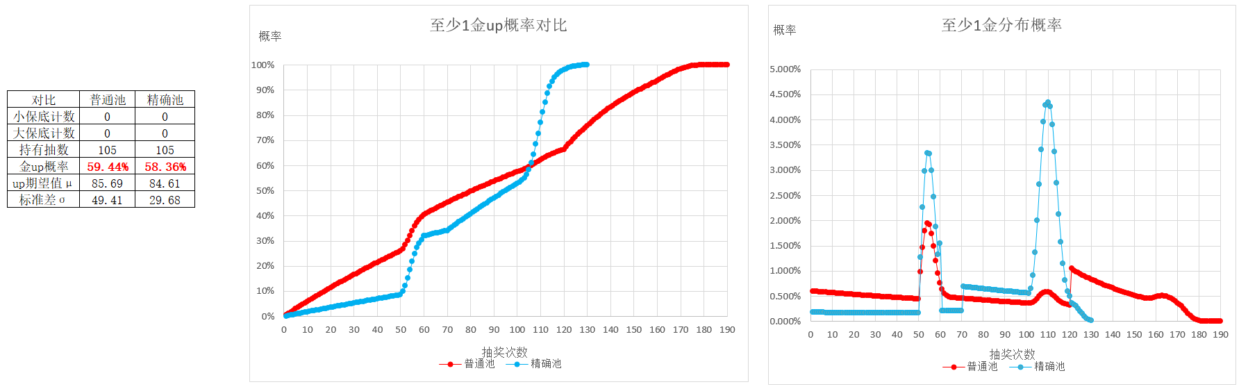 结论3:出金概率普通池高于精确池,普通池平均34抽1金,精确池平均47抽1金。对于平民歪了当补命格,普通池反而可能更优选。(触发保底,至少1金up期望即与至少1金概率相等,计算结果也确实如同奖池内标注)