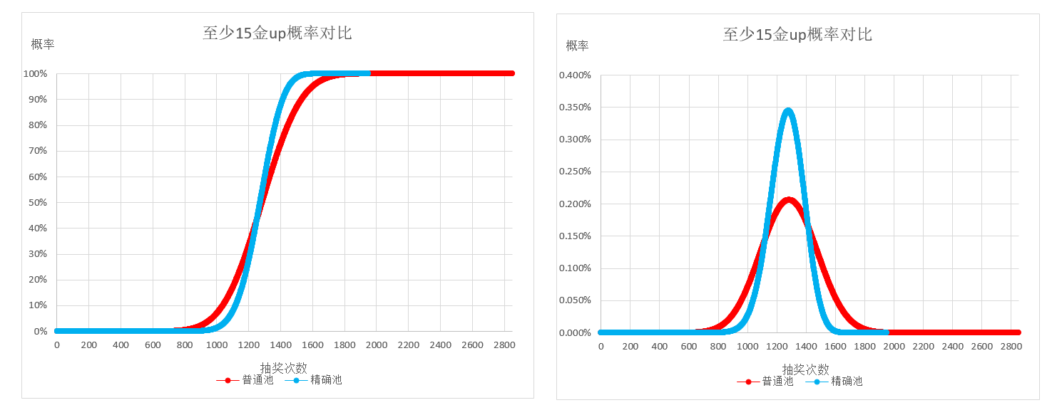 目标15up,1253抽及以下普通池概率更高,1254抽及以上精确池概率更高