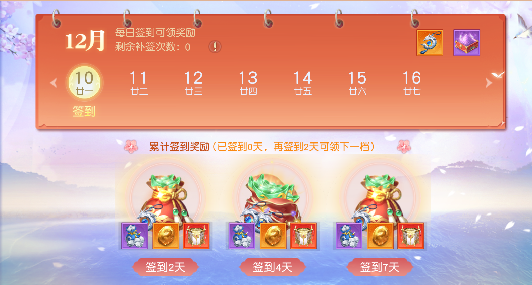1.每天可以在活动界面上签到,领取一次签到奖励。