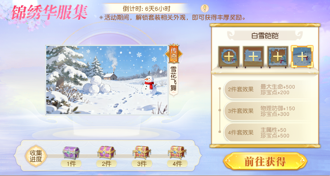 1.活动期间解锁白雪皑皑套装相关外观,即可获得丰厚奖励。