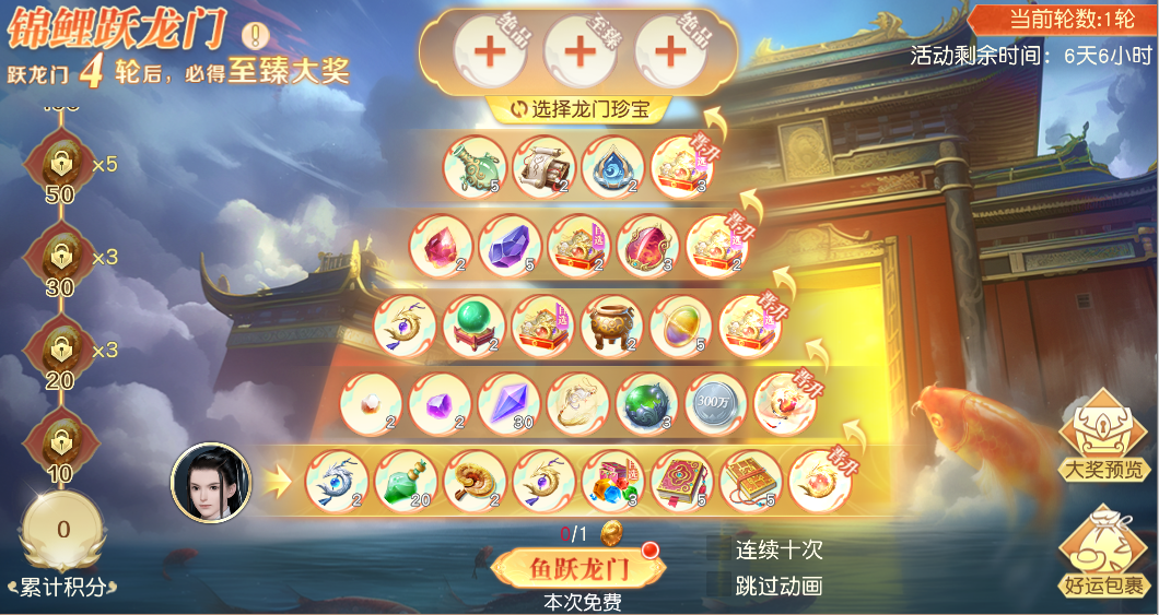 1.活动期间在主界面内的锦鲤跃龙门中每进行一次抽奖可获得1积分,用于化龙英杰榜活动中进行排名。