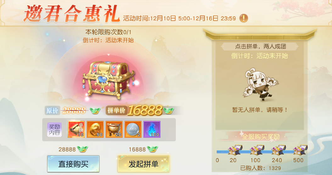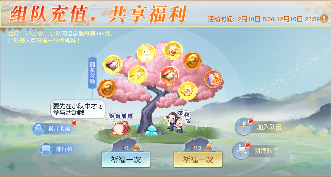 1.活动期间,组成1-5人小队,小队累计充值每满648元,全队可获得1次抽奖机会!