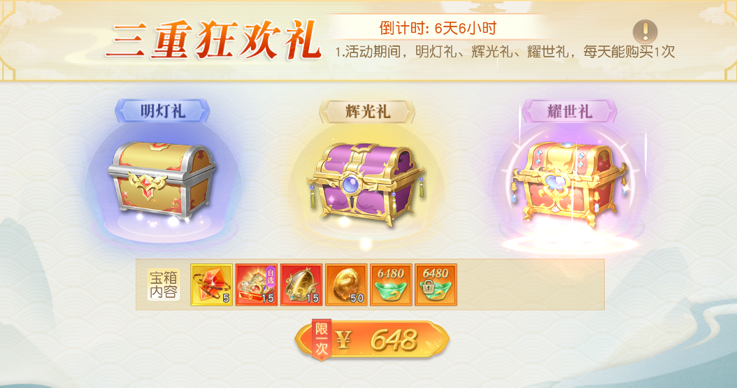 活动期间,明灯礼、辉光礼、耀世礼三个礼包活动期间每天可以各买一次。首周耀世礼有珍稀外观装扮。