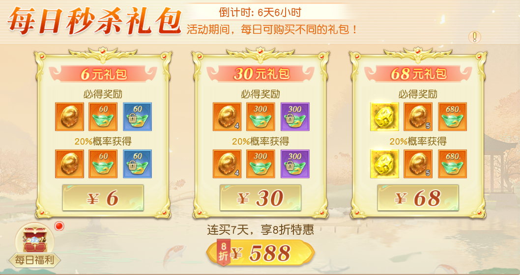 2、直接购买7日礼包可享受超值折扣,连领一周好礼!