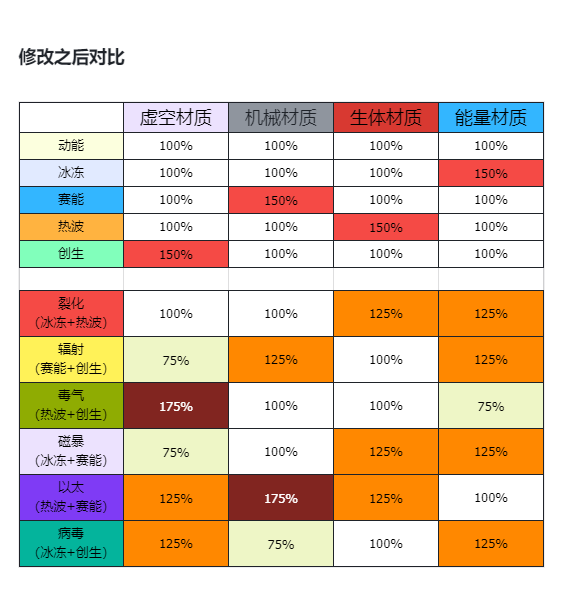 - 取消复杂的增伤/减伤关系,所有元素对各类材质均保证不低于100%的伤害倍率,避免因元素选择不当导致输出损失