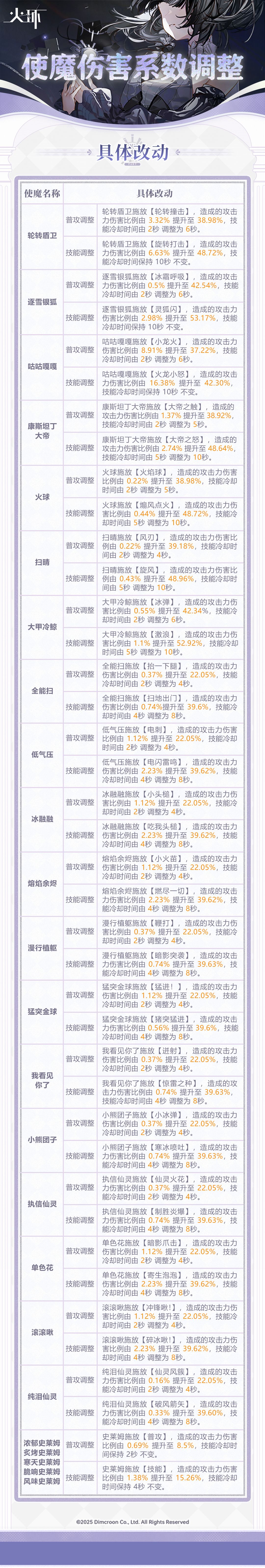 本次更新优化了使魔的战斗机制,使魔将能继承角色的伤害属性。同时,我们对部分使魔的伤害系数进行了提升,以全面强化其战斗表现。具体调整的使魔种类与数值详情如下: