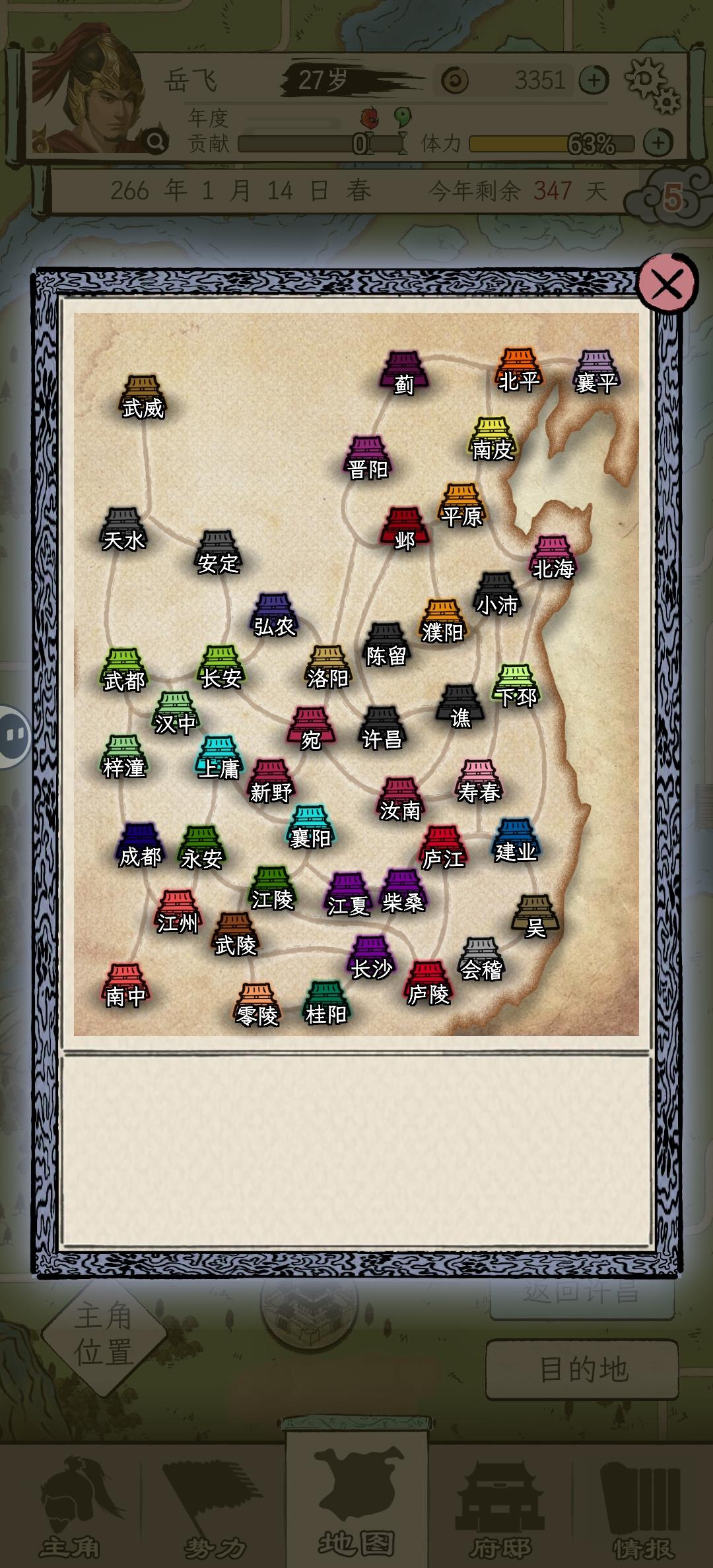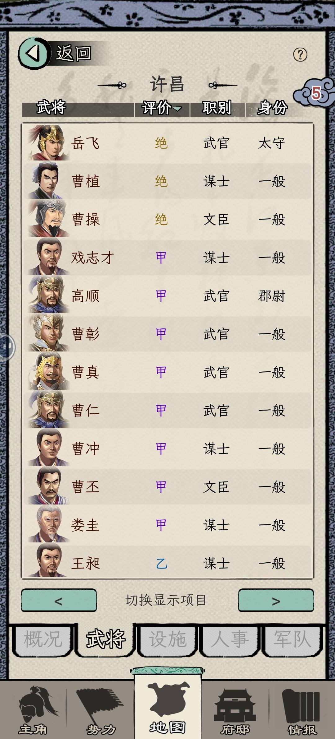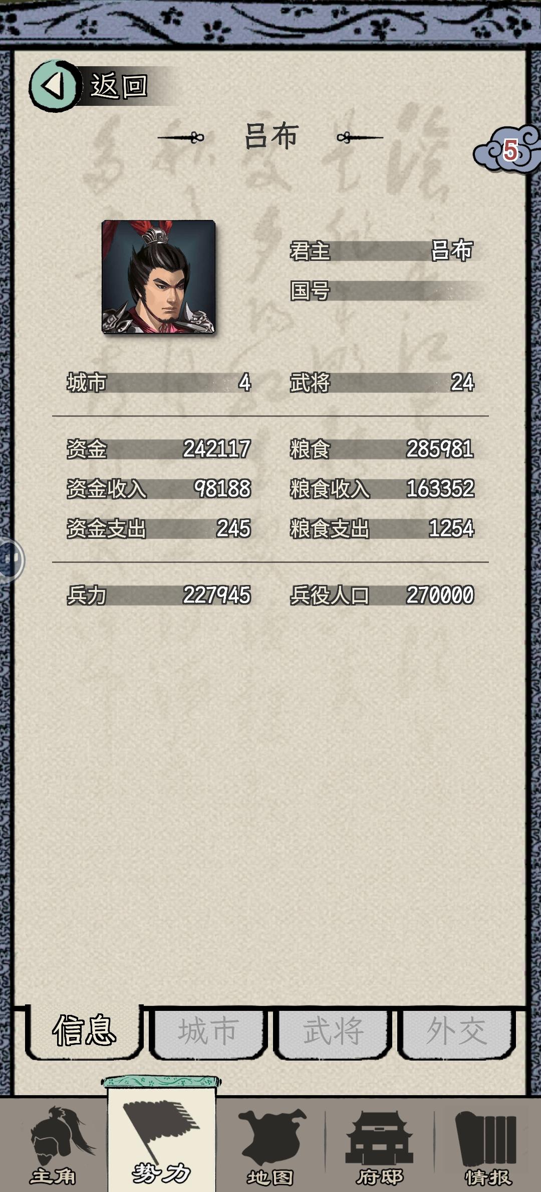 由于我在上一个档何进手下没混上太守,所以果断重开。这次我选的是吕布开局,在266年一月27岁(五品俩功)终于混上了许昌太守,此时吕布占据4城,陈宫张辽早就被派出去当二三城太守了,当时我还没五品。现在拿下许昌(灭操之战)吕布手下只有我属性最好官职最高,所以舍我其谁。