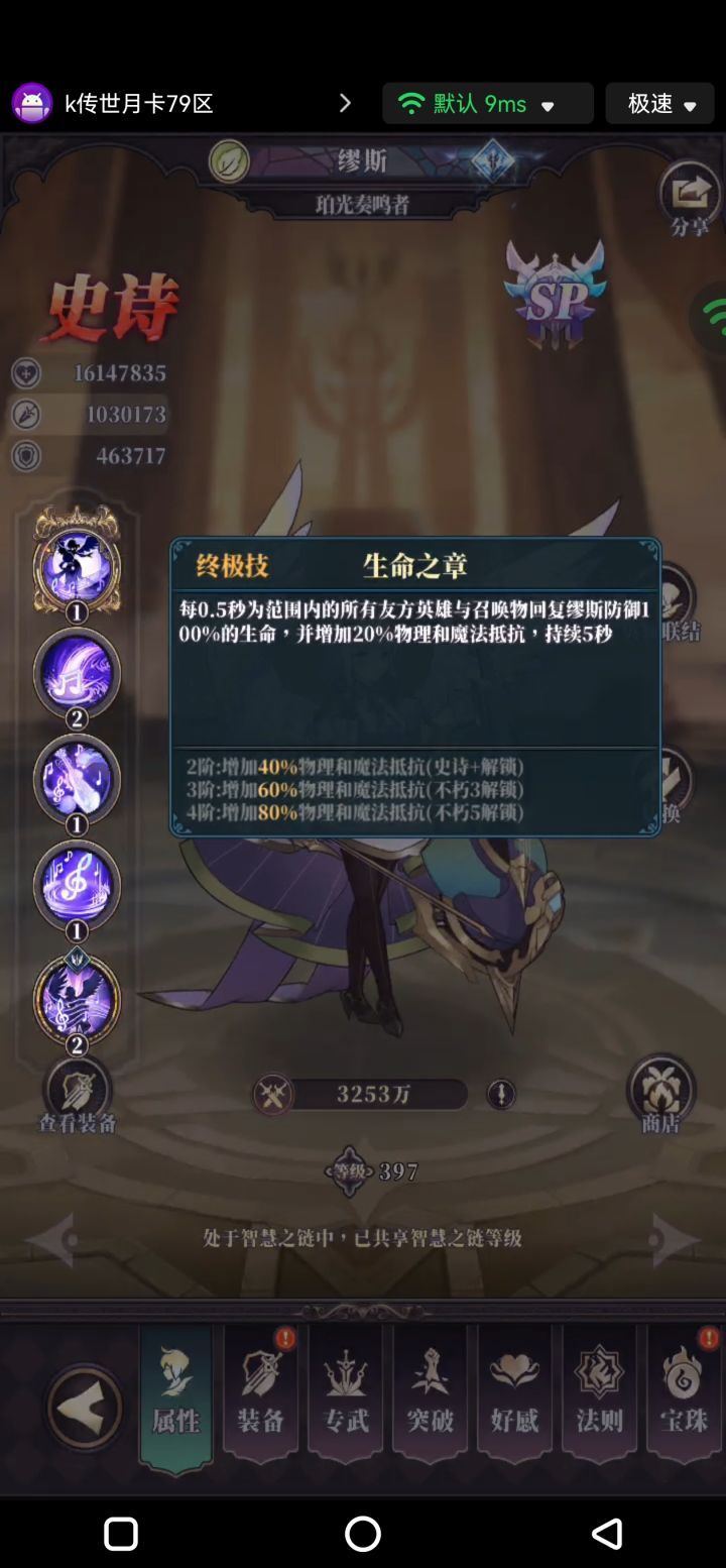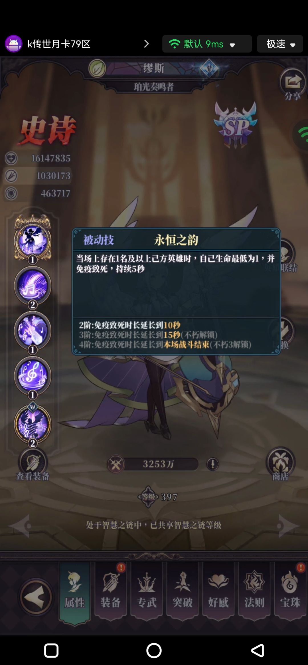 5. 神魔技能:永恒之韵:当场上己英雄存在一名及以上时,自身生命值最低保持为1并免疫致死,持续时间随技能等级提升,最高可实现全场免疫致死,大幅提升自身生存力。