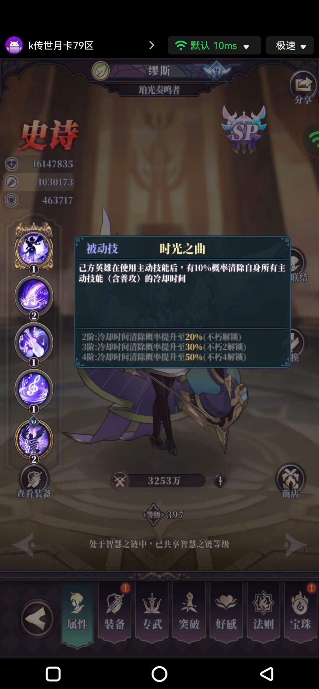 4. 被动技:时光之曲:友方英雄使用主动技能后,有10% - 50%概率清除自身所有主动技能(含普攻)的冷却时间,能加速全队技能循环。