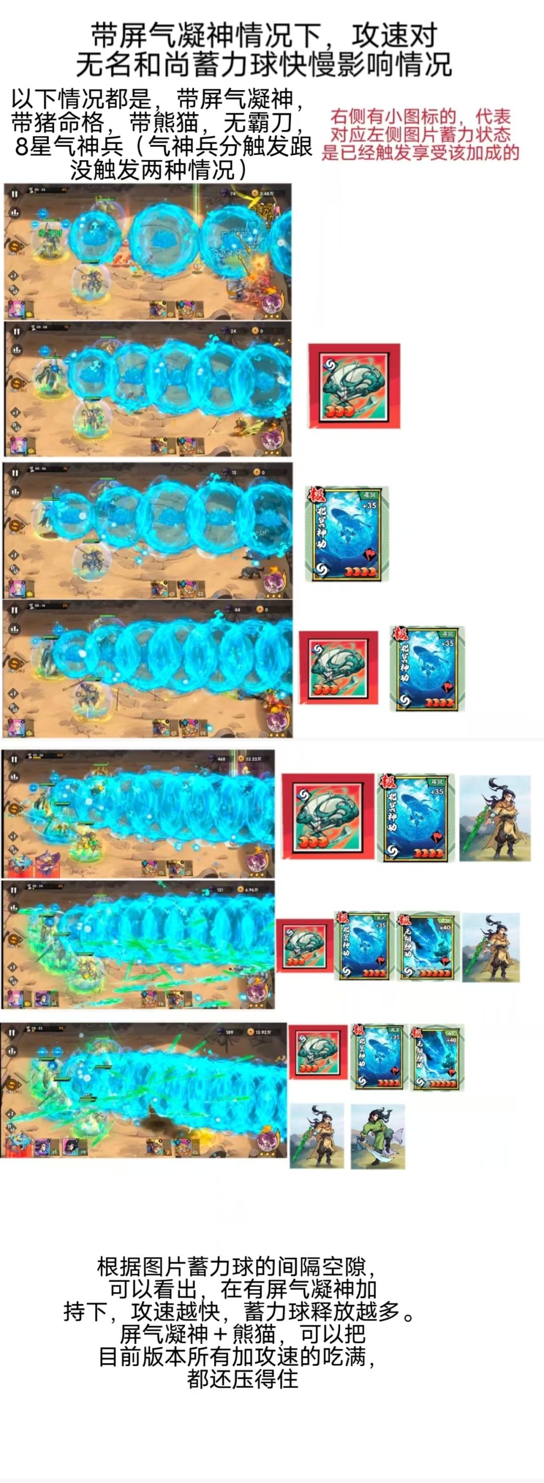 有些人说,我不带屏气凝神,带了熊猫,命格祈福洗蓄力速度,一样能蓄力,确实也能蓄力,但是达不到无视攻速的地步,只能把攻速控制到一定范围才能蓄力,或者说偶尔会乱,蓄力球的速度,密集程度也远远达不到图片最后那种效果,前面几种效果其实推图也够用了。(蓄力无视攻速影响,是指无论多快的攻速,出手百次,千次,万次,每一次都会必定蓄力,不会漏一次,这只是单纯的极限测试)。。正式推图的时候,其实用不了那么多攻速,再加上蓄力偶尔压不住,漏了关系也不大,所以说不要屏气凝神也行,换成输出技能收益更大,不带屏气凝神,命格祈福就要洗蓄力速度。