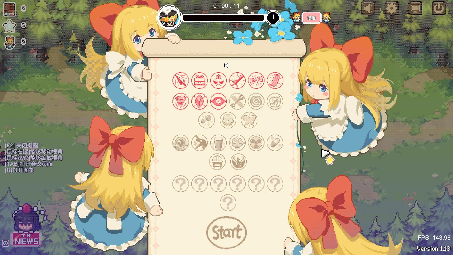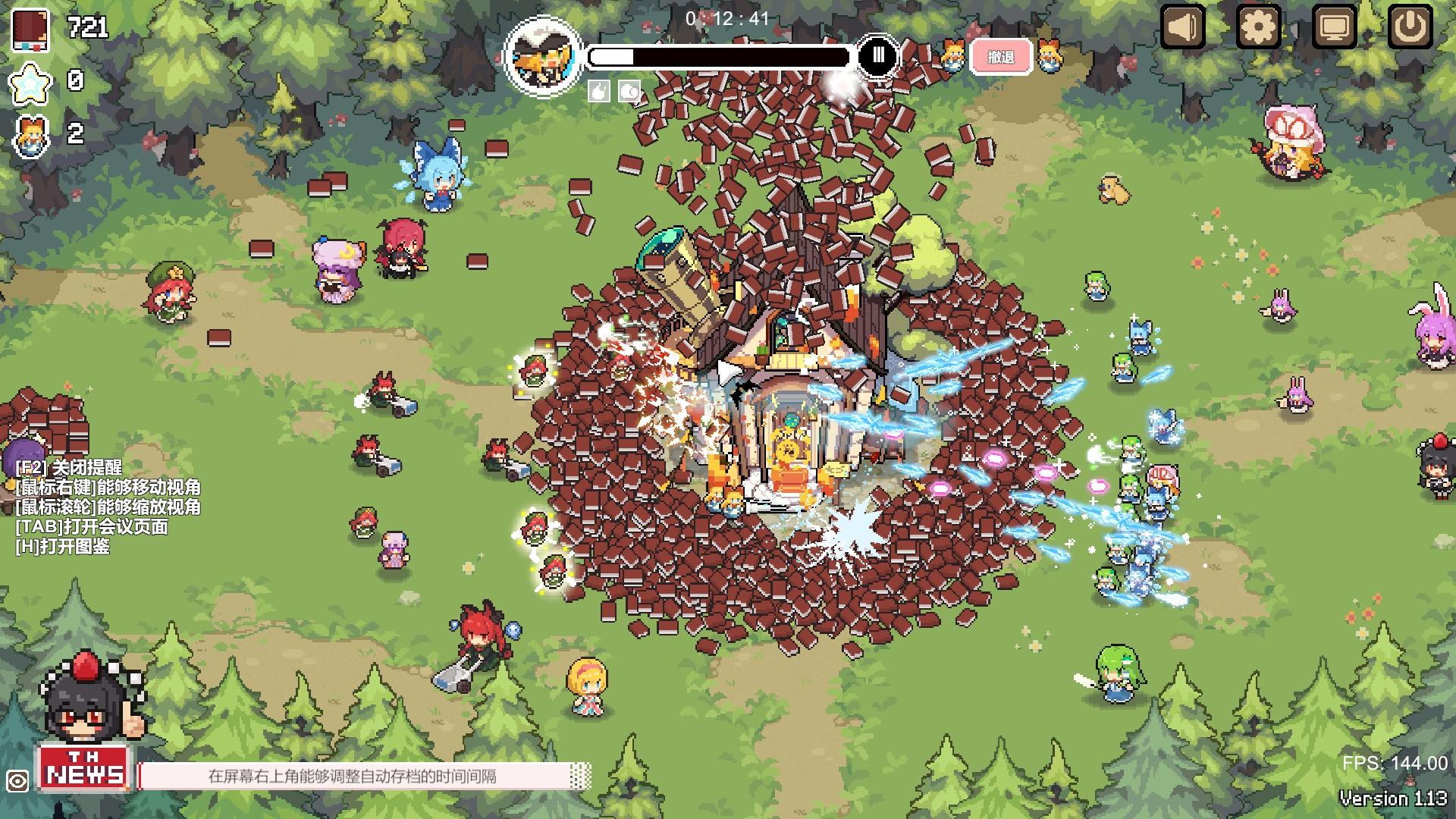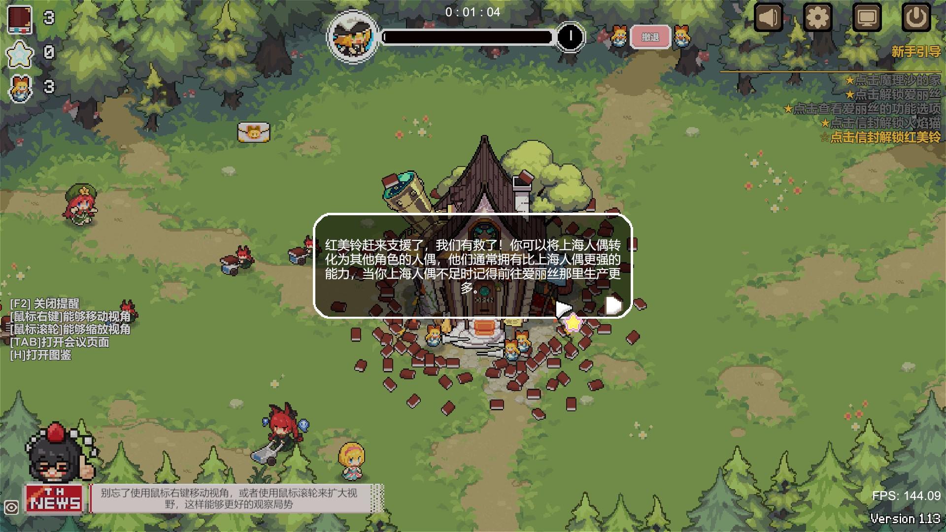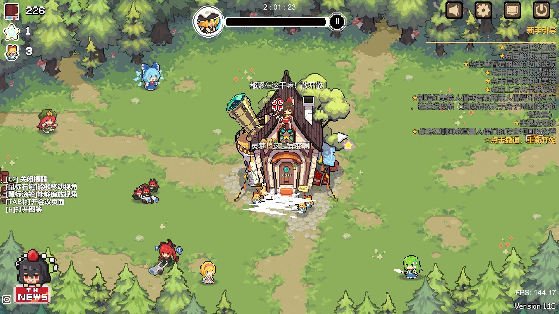 游戏的玩法很简单,爱丽丝的人偶攻击住宅会掉落书籍,猫猫会将书籍收集起来送回到基地,我们就可以用这些书籍升级每名角色的几个技能,有些技能是一次性升级就满级的,有些技能要源源不断的升级。其他角色需要消耗爱丽丝的人偶才能解锁这些技能。上方有进度条,进度条走满,魔理沙就会不耐烦的出来,我们就进入了BOSS战环节,我方是没有血量限制的,被击倒的人偶过段时间会恢复过来,但如果完全打不动敌方的血,或者收集的书籍没有魔理沙捡回去的速度快,那么我们就陷入了僵局只能撤退。