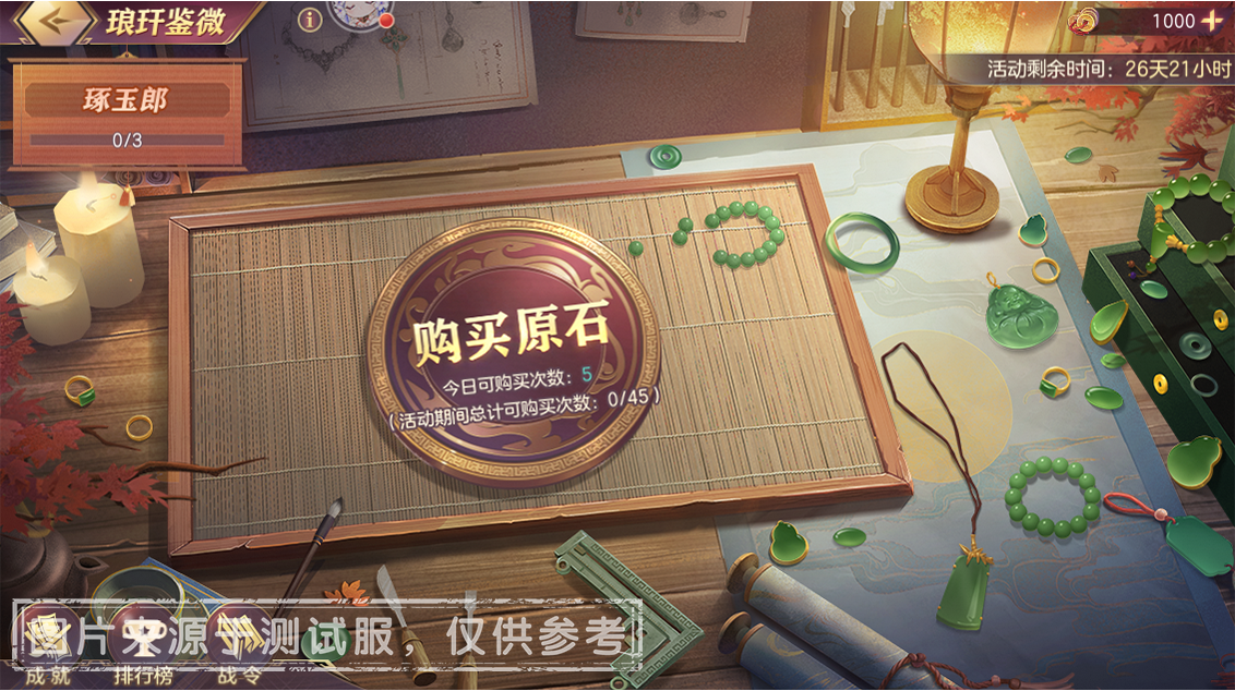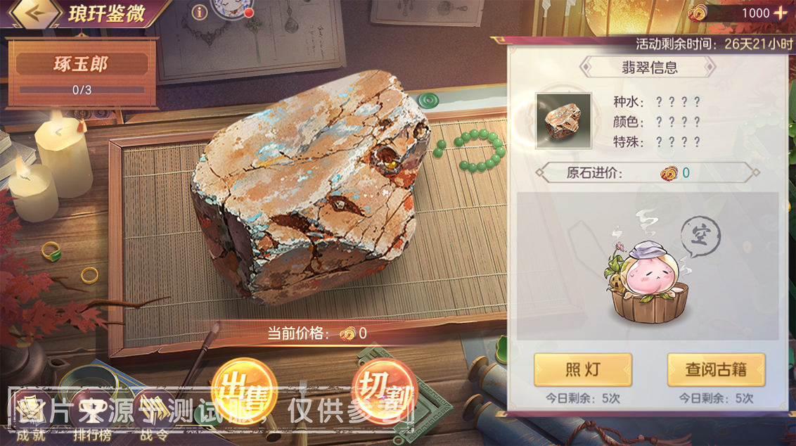 点击活动主界面左侧【琅玕鉴微】模块即可进入,首次进入该活动将获得原石启动资金-「郡库匣钱」用以商店内购买原石。购买后通过【照灯】与【查阅古籍】来评估原石价值,并其应对其执行【出售】或【切割】操作。
