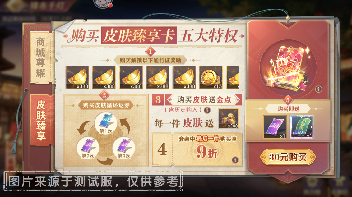 1.贵宾卡补贴:开通【皮肤臻享卡】后,可获得「百衣补贴20元优惠券」*1、「月雅集皮肤30元优惠券」*1,以及购买皮肤返券获得10、20元优惠券。购买套装内最后一件皮肤时可享受9折优惠,该折扣可跟优惠券叠加使用哦。注意:在选购皮肤时,默认消耗优惠最大的优惠券。
