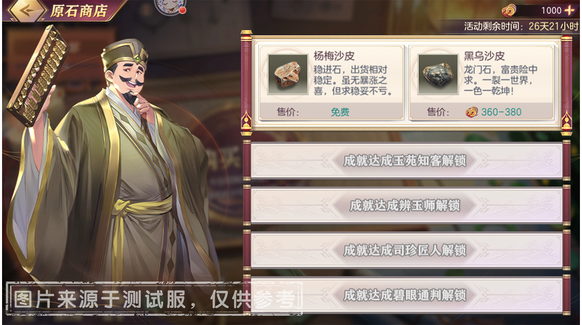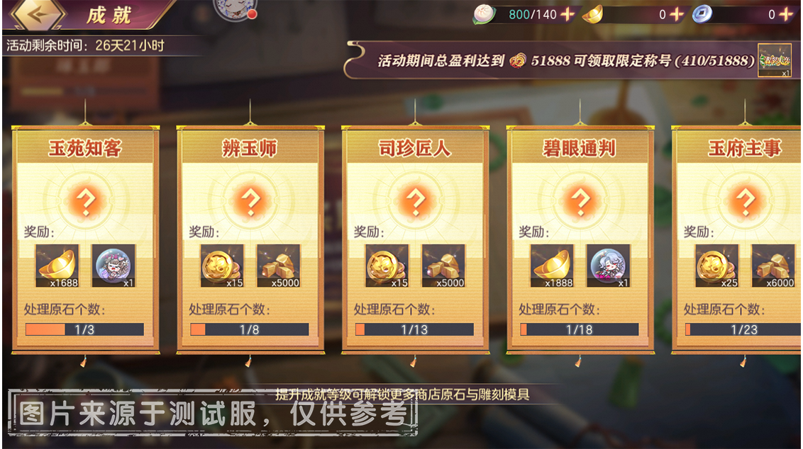累计原石出售数量可解锁购物节【拈翠纪】对应阶段奖励,免费获得元宝、「金饼」奖励。