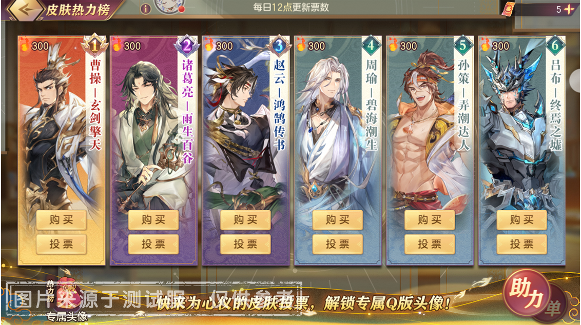 本次将集结所有返场皮肤供玩家选择投票支持,购买或为皮肤投票均可增加其热力值。本次热力榜最高热度皮肤后续将会制作其专属定制Q版头像-「热力榜Q版头像」,参与玩家皆可获得。累计投票数量达到指定阶段可获得对应奖励,包含元宝*1776、「金点」*12000。