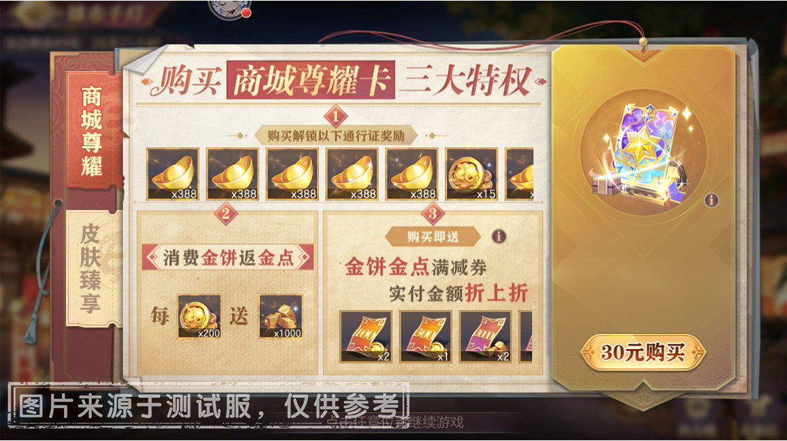 拥有贵宾令牌的小将军,可额外获得「月雅集皮肤30元优惠券」一张。