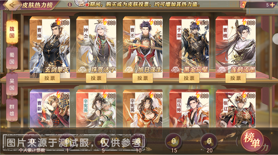 1、年度皮肤热力打榜活动来袭,点击“锦市千灯”主活动界面右下角【热力榜】或点击左侧轮播图【皮肤热力榜】进入参与,每日可获得5张选票。