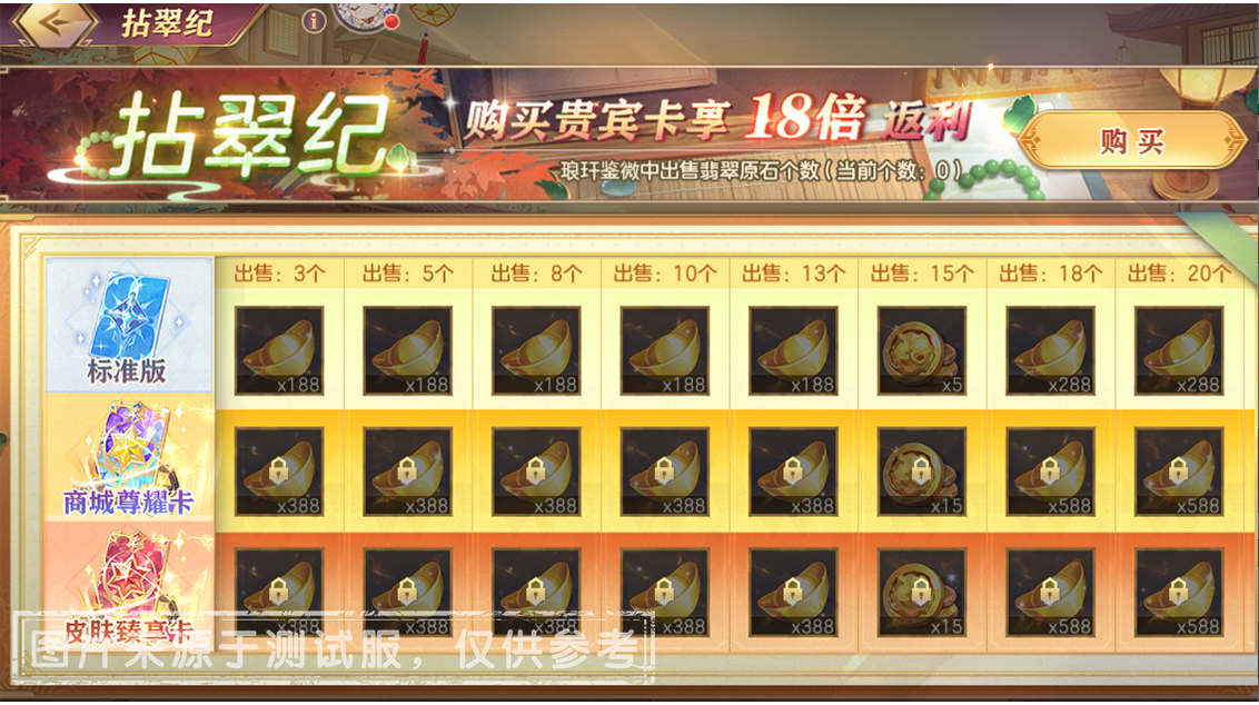 活动期间,“拈翠纪”通行证限时开启,将会根据小将军在【琅玕鉴微】活动中累计出售的原石数量,解锁对应档位奖励,可获得金饼及元宝奖励。小将军们也通过购买两种贵宾礼遇卡【皮肤臻享卡】&【商城尊耀卡】,解锁额外贵宾档位,获得加倍奖励内容。