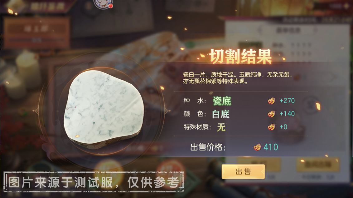 【切割】——一刀切开,可展示原石本貌。若切割出的原石内有缝隙则对售价产生较大影响,建议选择二次加工【前往雕刻】,将部分完好的玉石雕刻成品进行出售,可挽回损失。