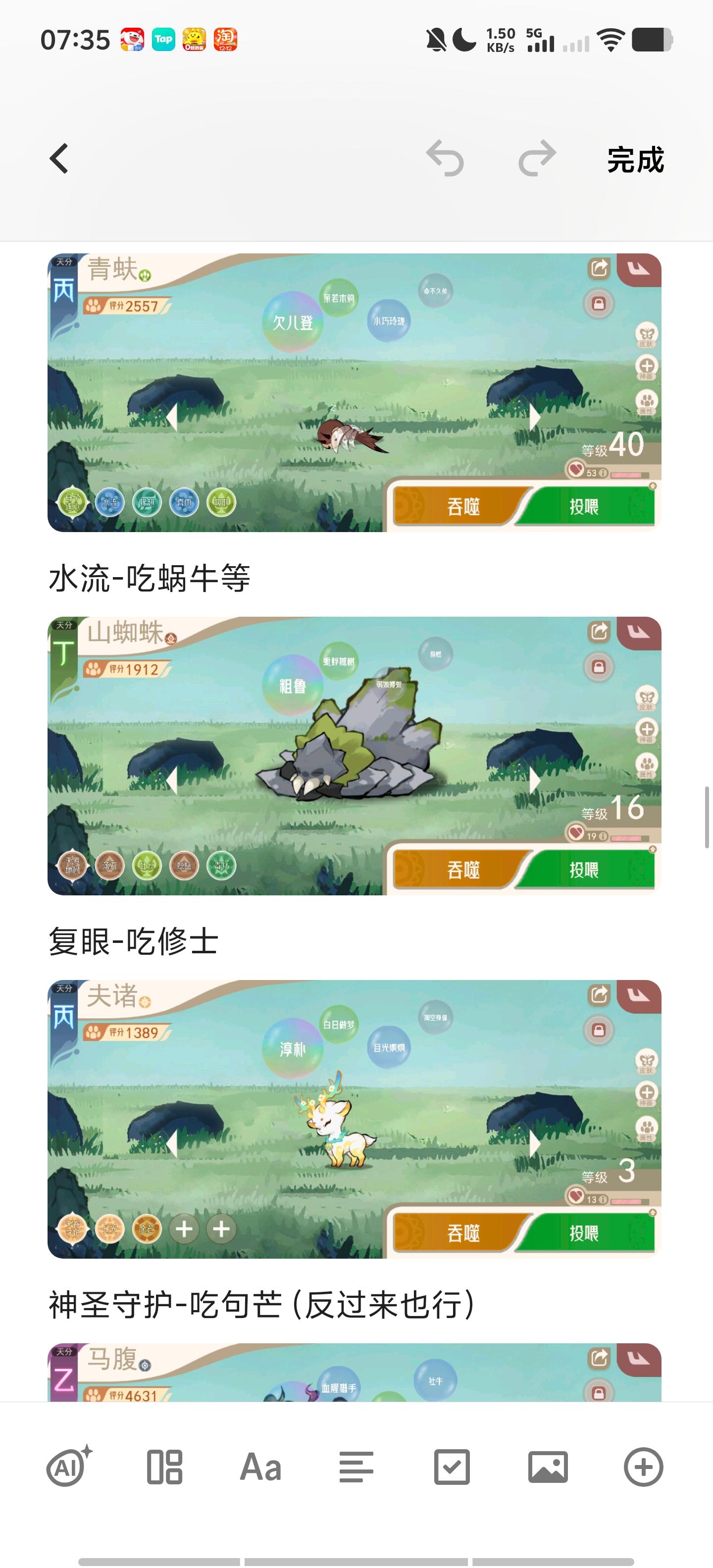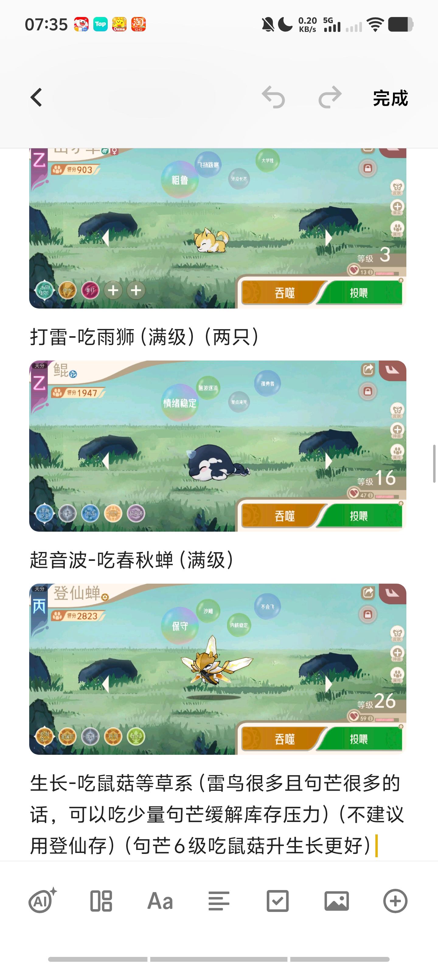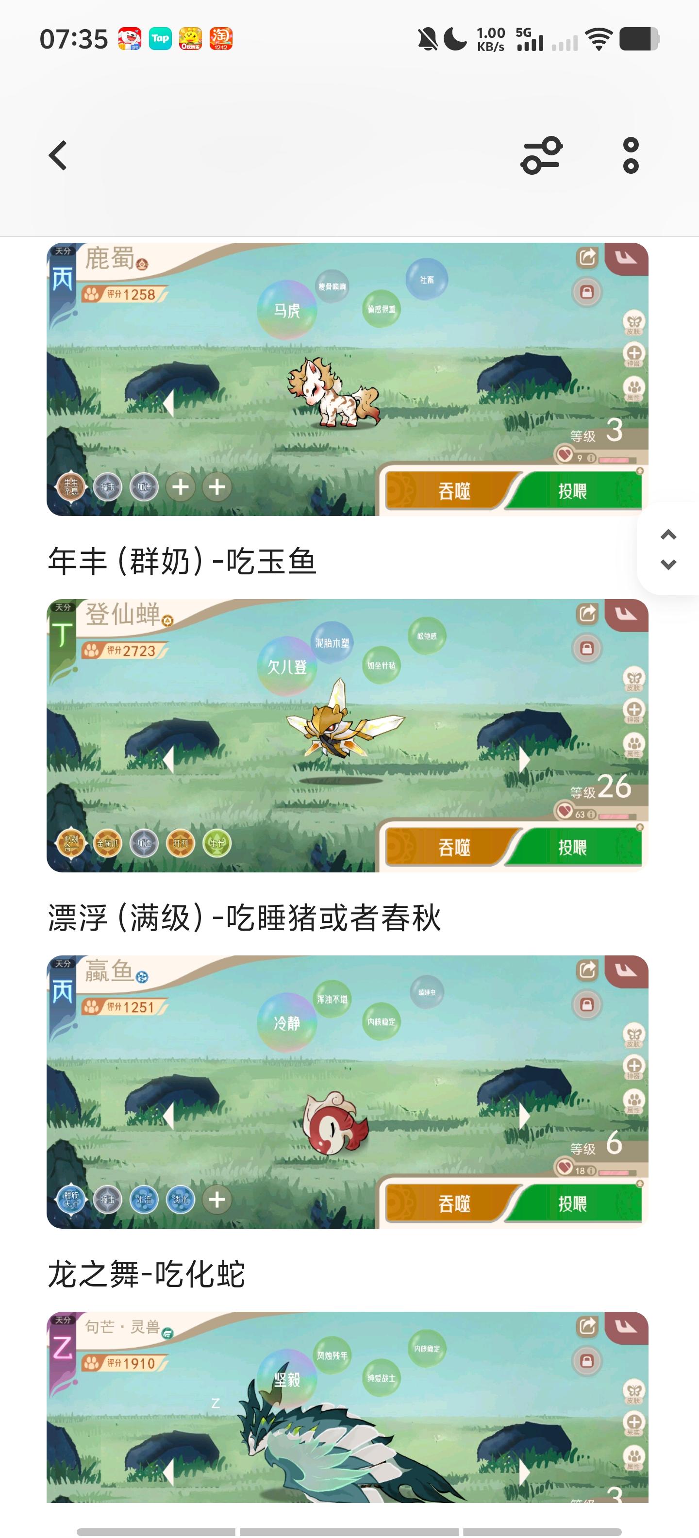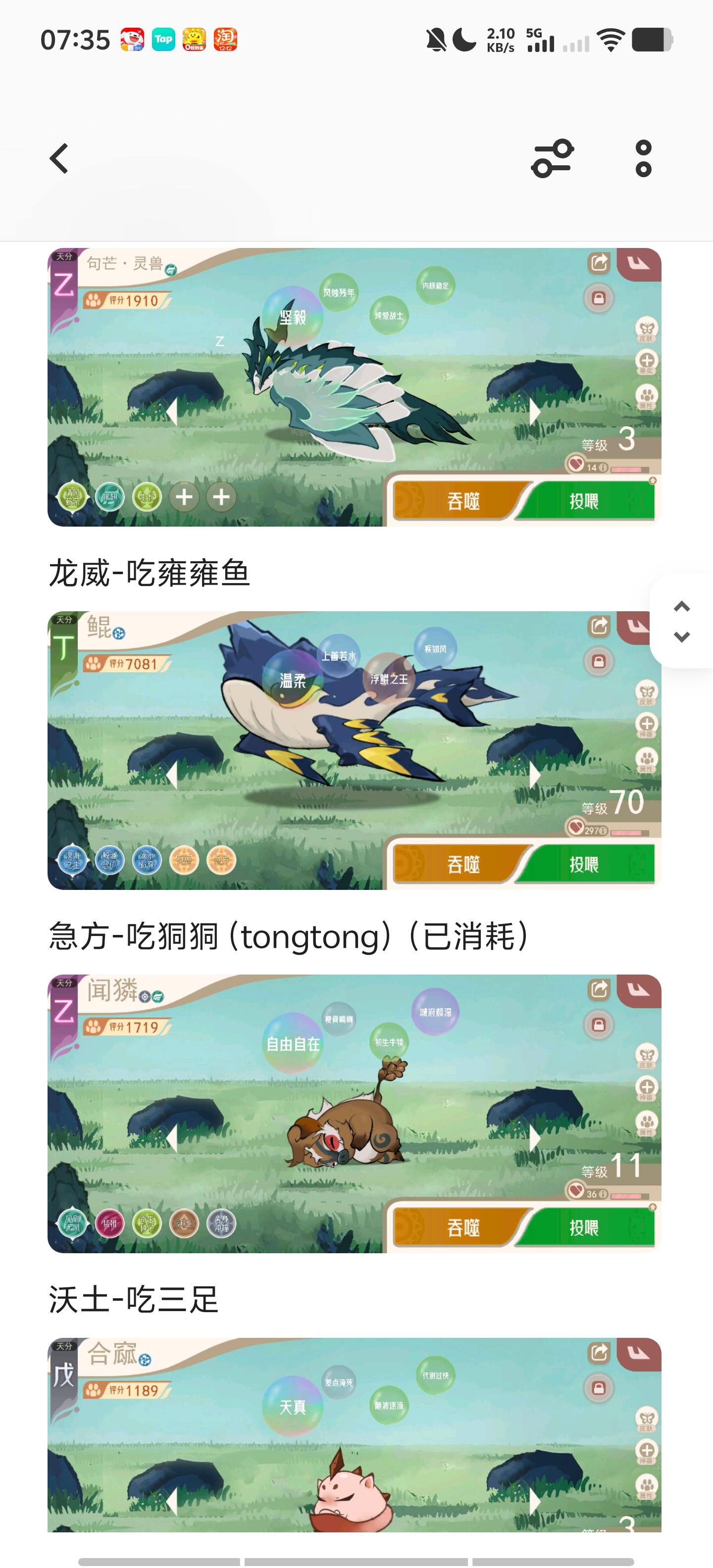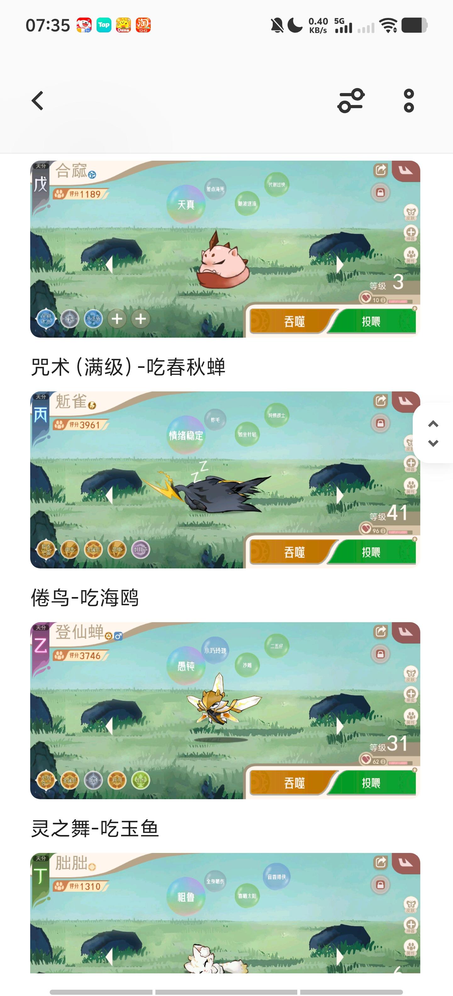 最下面的截图都是这个概念,也可以直接狗粮和目标精灵(不心疼的情况下,刚刚的雨狮也可以直接作为存经验精灵),我上面的截图就有用登仙蝉(鲲也是如此)作为存经验精灵,这样最后会亏损一只登仙蝉,但是修士实在太多了,只能想办法消耗,月鸟什么没满的也可以拿春秋蝉去升晦暗。