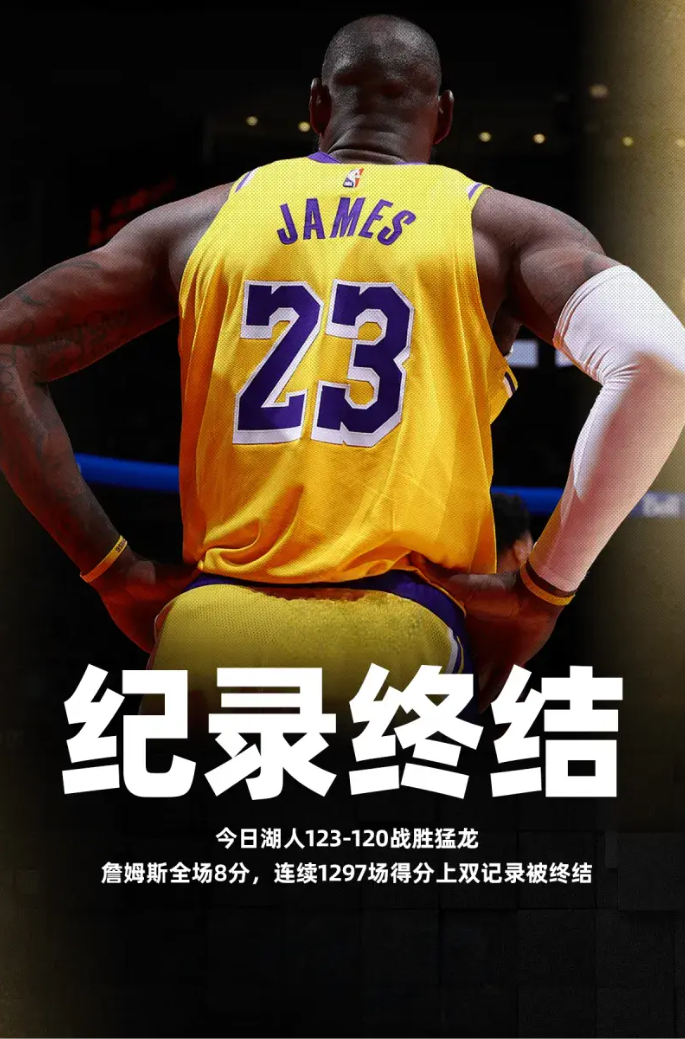 本场比赛,詹姆斯全场得到8分6篮板11助攻,其连续1297场常规赛得分上双的纪录中断。