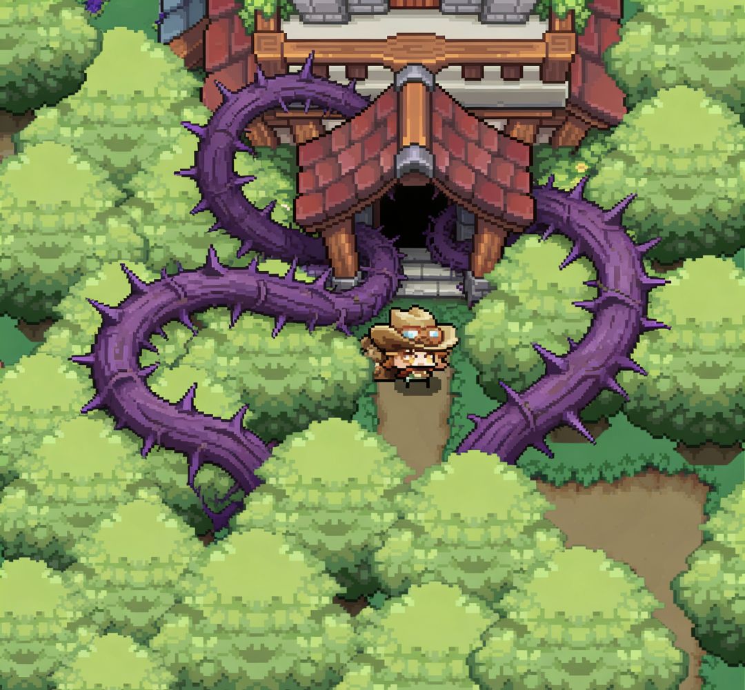 兜兜转转许久,一座古老的建筑出现在我的眼前,门口盘绕着巨大的紫色荆棘,令人望而生畏。我不禁有些讶异,最著名冒险家都没有找到的传说,居然能被我发现吗?