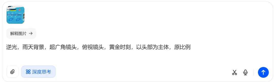 第二步,前往常用的AI网站或软件,上传截图并输入指令:“逆光,雨天背景,超广角镜头,俯视镜头,黄金时刻,以头部为主体,原比例”,之后点击生成按钮。