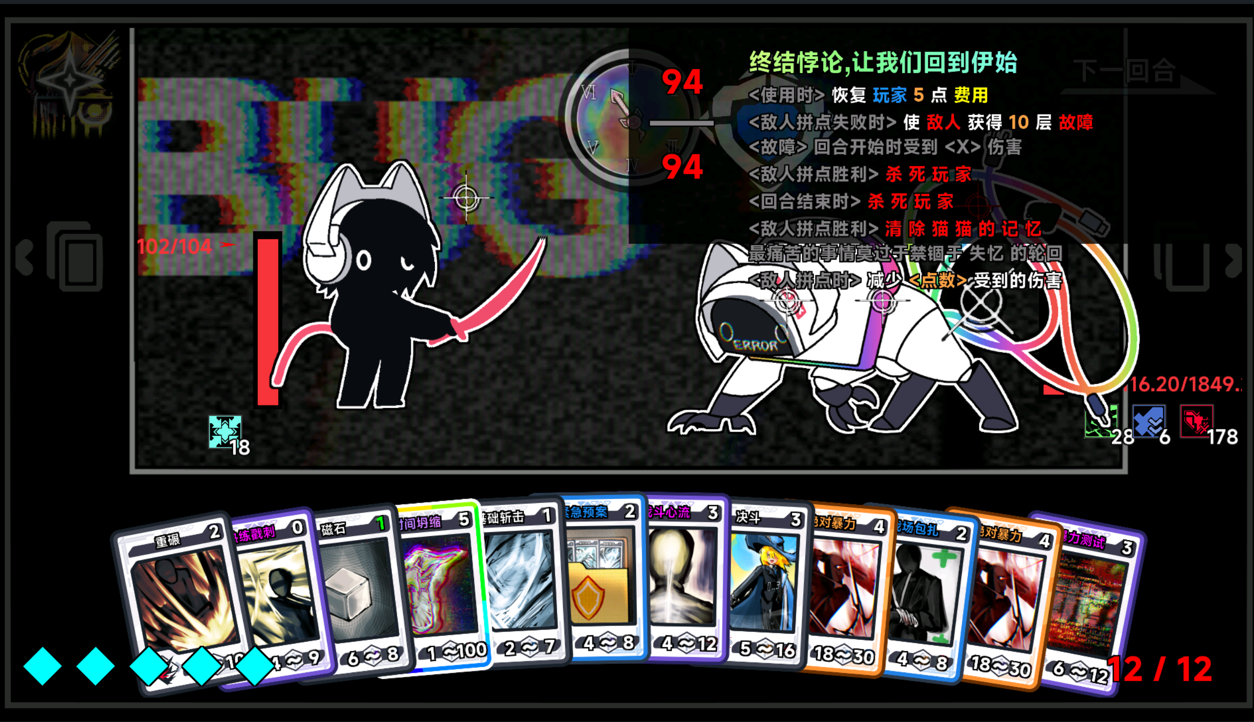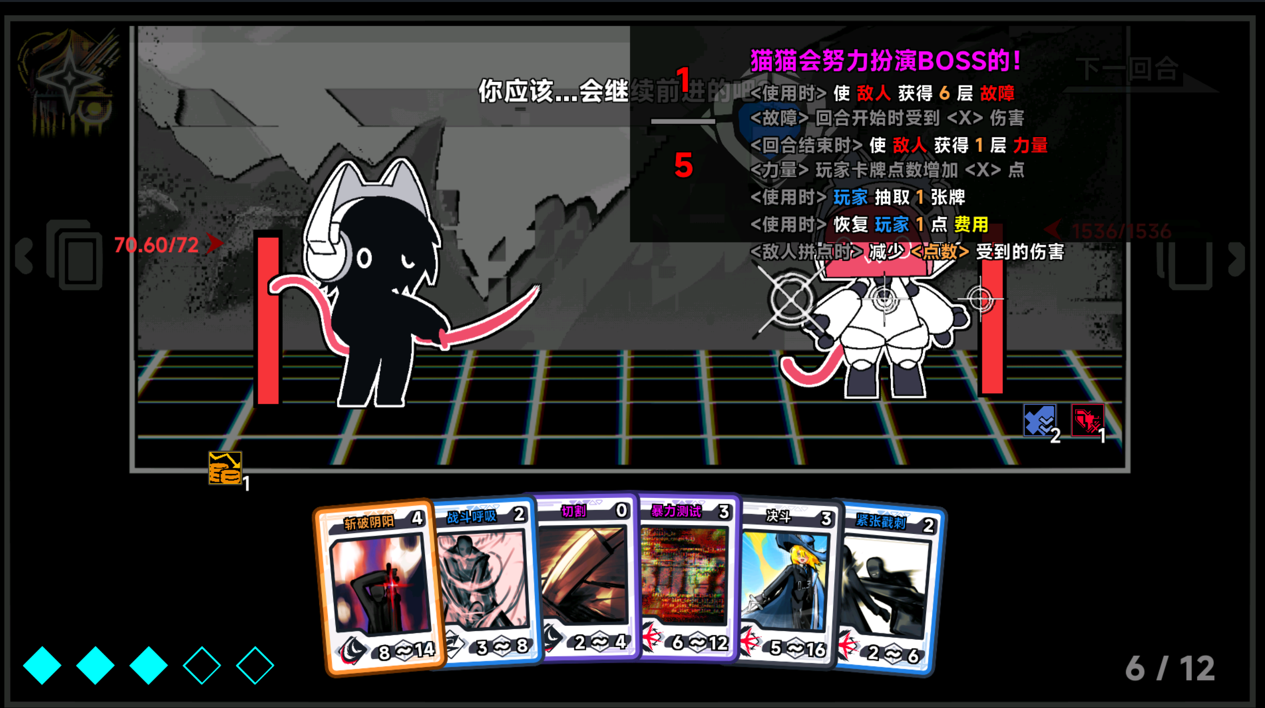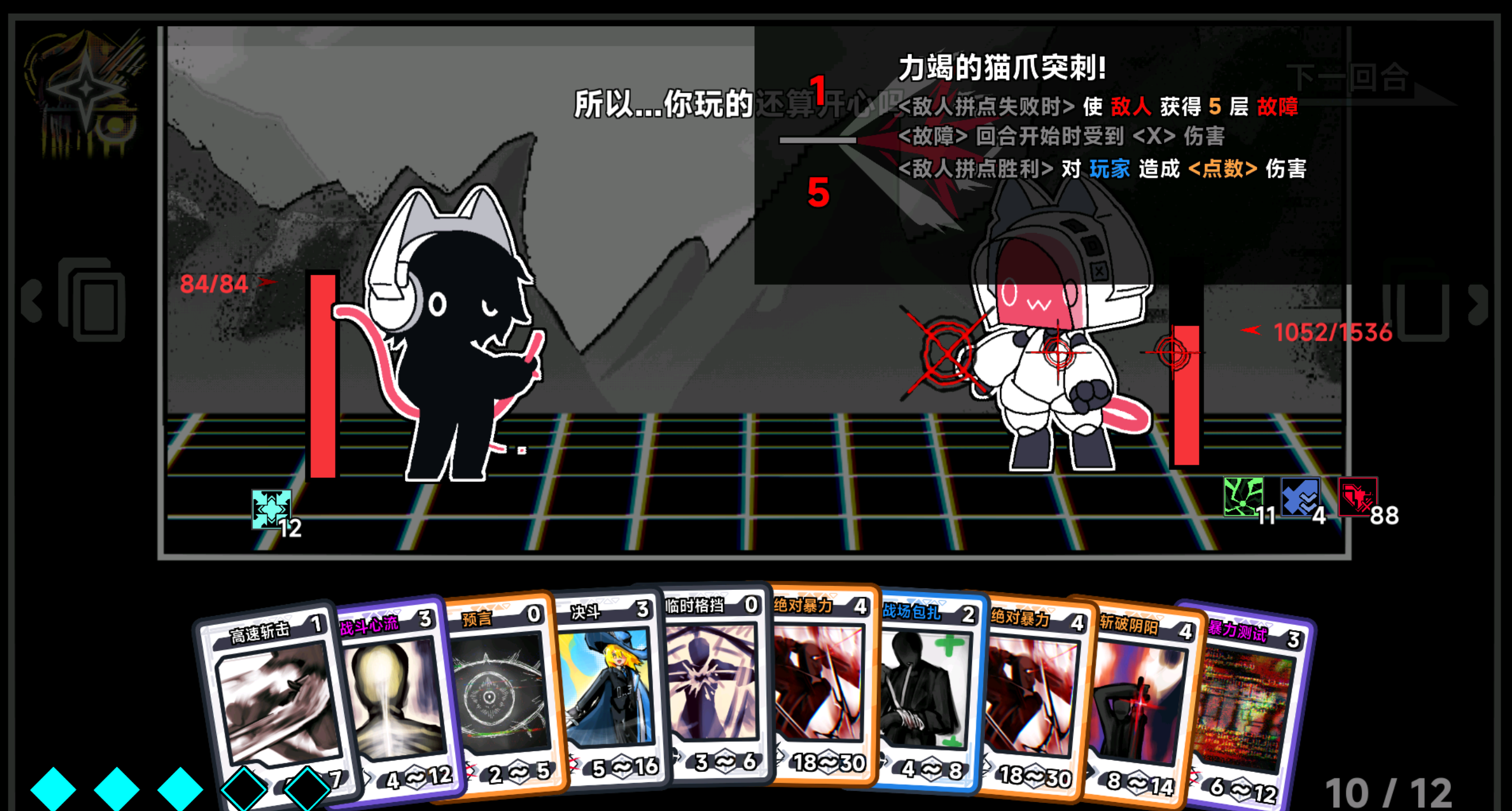 首先一定要把努力扮演给拼掉, 叠好故障, 不要让猫猫力量叠满了, 这里建议防御和功能牌和努力扮演去拼 ,或者叠加破裂和故障的卡去拼