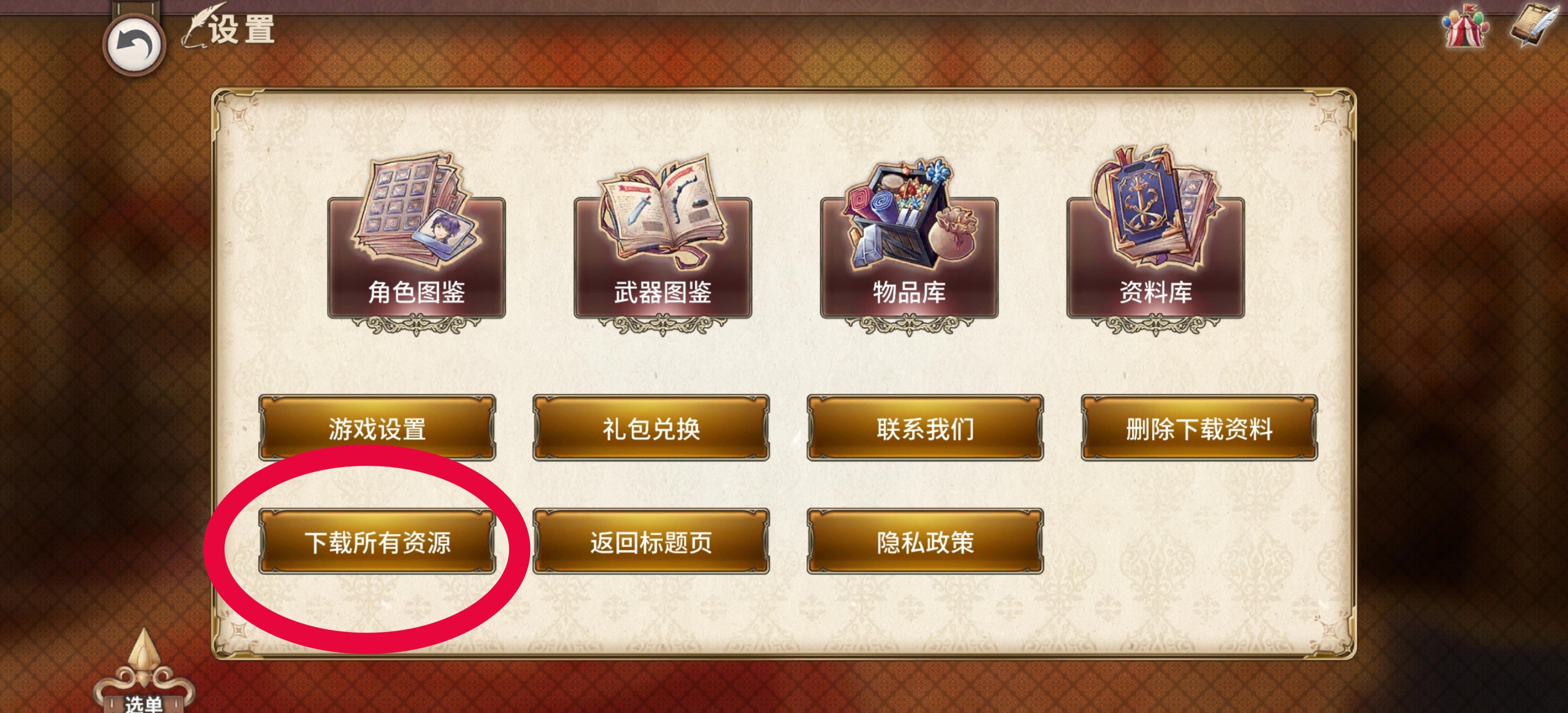 首先我们刚下载进入游戏后,点开主界面右上角的设置,会发现诶!这里还有一个“下载所有资源”的按钮,点这个按钮就能下载所有资源啦