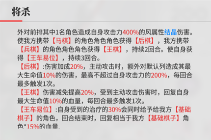 棋子赋能:携带【马棋】的队友获得 2 回合的【后棋】(伤害加成提高 20%,主动攻击时,额外对默认列造成 10% 最大生命值伤害,最高不超过自身攻击力的 200%,每回合最多触发 1 次);携带【兵棋】的队友获得 2 回合的【王棋】(伤害减免提高 20%,受到主动攻击伤害时,回复 10% 最大生命值,每回合最多触发 1 次);