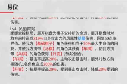携带【马棋】的队友获得 2 回合的【车棋】(暴击率提高 20%,主动攻击暴击时,对敌方前排随机 1 名角色造成 200% 的伤害);携带【兵棋】的队友获得 2 回合的【升变】(抗暴提高 20%,受到暴击攻击时,降低 20% 受到的伤害)兼顾强化前排单位输出与生存。