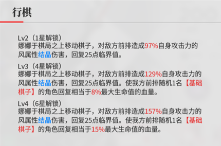①棋子成长:每当我方角色累计行动 4 次,娜娜给前排随机 1 名【基础棋子】补全第二个基础棋子效果,整场最多触发 3 次,最终可让前排全员集齐双棋子;