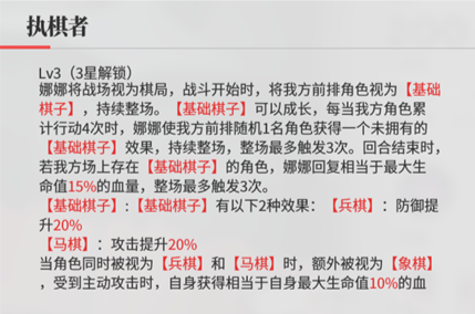 ③自我续航:回合结束时,若我方有携带【基础棋子】的角色,娜娜回复 15% 最大生命值(整场最多 3 次),保证自身稳定存活。