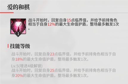 战斗开始时,自身恢复 25 点临界值,给前排角色施加相当于自身 20% 最大生命值的护盾(整场最多触发 1 次)—— 提前给前排套盾,配合【基础棋子】的防御加成,强化前期生存,同时加速临界技启动,能提高队伍容错,建议开启誓约技能。