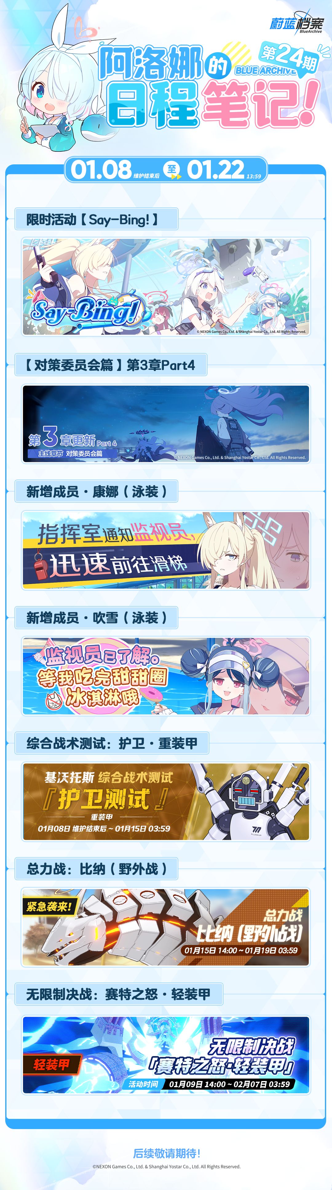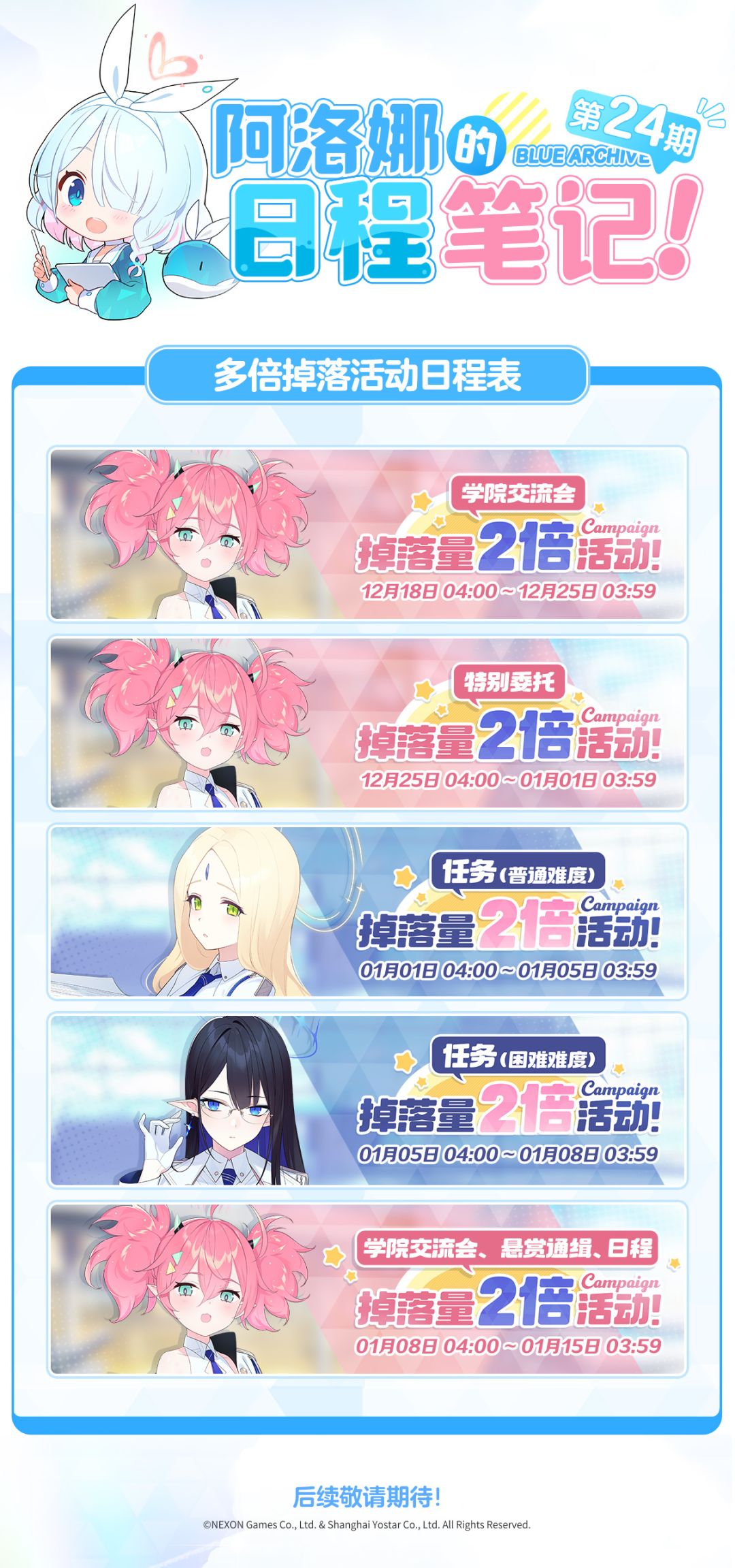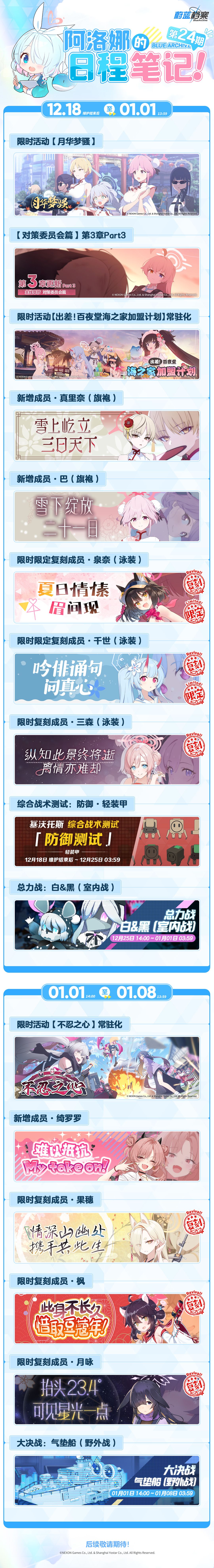 日程笔记仅供老师参考未来版本更新后活动内容及招募时间等内容,具体活动规则还请老师关注后续官方社媒及游戏内、官网的公告。下方附带了当期版本日程笔记长图,其中包含了期间的活动开放时间安排以及多倍活动的开启日程,以供老师参考~