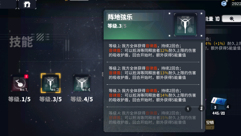 - 加点推荐:跃升天赋2战场礼仪升满是100%概率获得同步率,推荐优先加满。3技能庆典演出会增加行动提前率,推荐第二个加满,2技能阵地弦乐加等级只加回血量,能量值回复是固定的,生存压力大就先点。技能书紧缺的也可以升满跃升天赋2之后直接111使用。