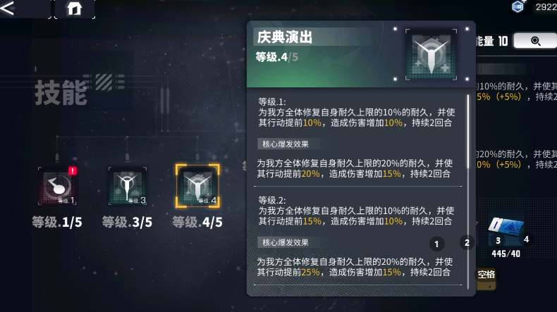 - 3 技「庆典演出」:群体回血 10 % 血上限、行动提前 10 %、增伤 10 %,爆发窗口神器。