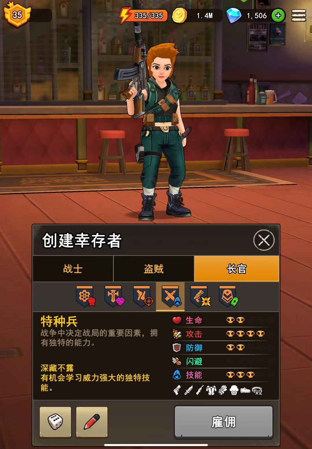 幸存者有三个类型,每种类型6个小职业,所以共18个不同职业的幸存者。不同幸存者的区别主要是1.属性成长不同(看右侧那个五维表)2.可穿戴装备不同(看五维表下面那行,就是可佩戴装备类型,和前文的打造图标是一样的)3.自带技能不同。技能分自带技能和后天学习技能。后天技能的强度和佩戴的装备决定了幸存者的强度。 技能升级的时候随机获得,可以通过骰子洗技能(我还没开始洗,还早,应该是后面的大坑,也是主要的养成和氪金内容)。