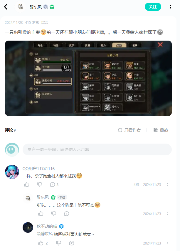 “网上流传的‘一条狗引发的血案’,就是玩家看狗不顺眼,一刀砍死引发的连锁反应。”
