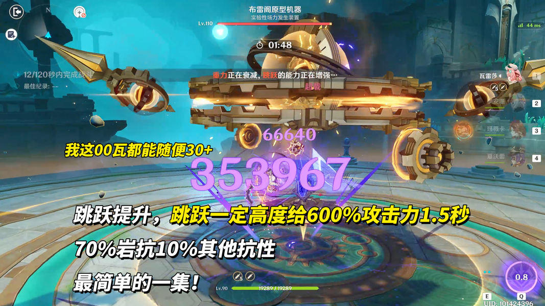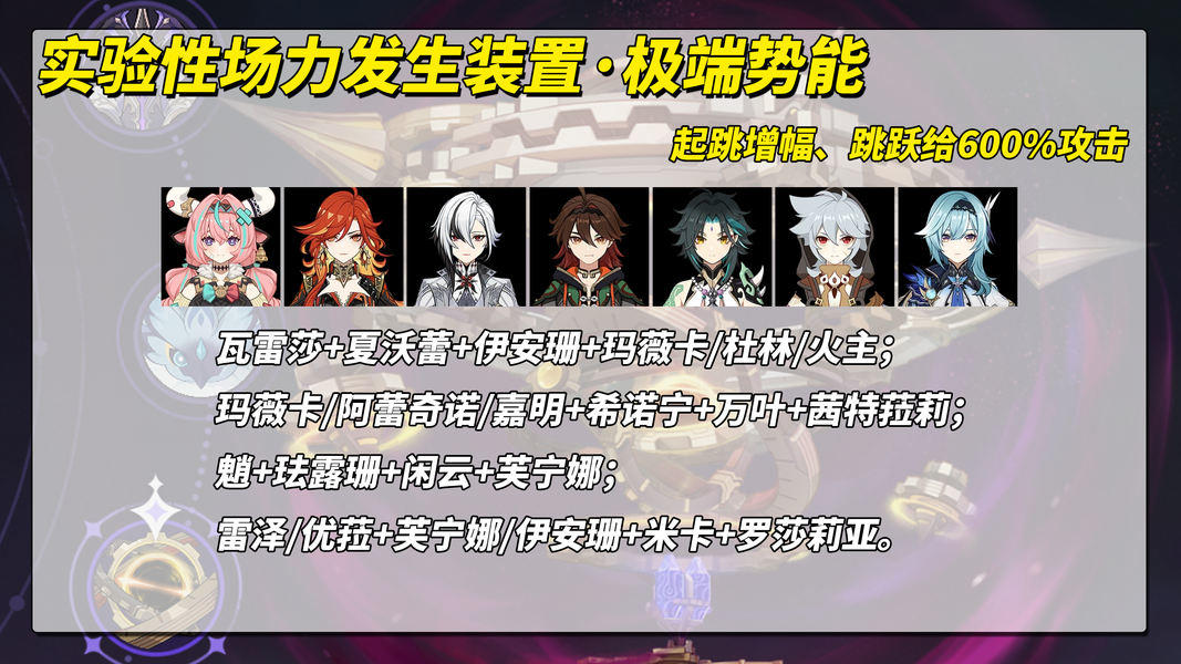本期最简单的一关!对局中实验性场力发生装置会展开重力场,大幅提升场上角色跳跃高度,可直接原地打出下落攻击伤害。并且新增机制“跃起一定高度后提高600%攻击力1.5秒”,那还说啥,全员下落攻击完事~