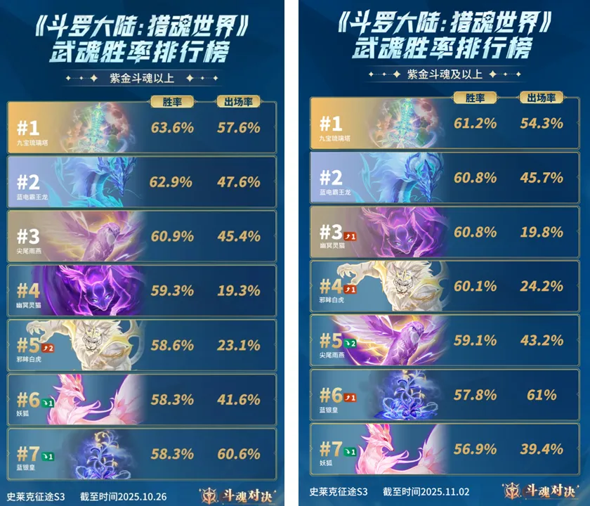 不过在官方今天公布的最新榜单中,这个数据就相当有意思了......因为这个数据是截止到11月30日的,相当于其就是包含了上个赛季从11月3日-11月30日的全部战斗数据了,对于近期PVP强度的变化还是有很大指导性的。其中大家可以明确的发现,之前那两个榜单中有几位角色居然不见了踪影?他们便是宁荣荣、蓝龙、狐狸和白沉香......而考虑到此次新版本中胜率最低的风笑天都有52.6%的幅度,所以在上个赛季的PVP战斗中,宁荣荣、蓝龙、白沉香这三位角色都应该都10%左右的胜率下滑......哎,当然宁荣荣的下滑大家也可以理解,毕竟叶原目前这个PVP的强势程度只要大家玩到后边的高段位都能明白,不过蓝龙和白沉香的陨落就真是让人有点唏嘘不已了,尤其是蓝龙这位在PVP排行榜上连续坚持了11期主C第一的怪物,突然有一天居然看不到他的身影了,这真的还蛮不习惯的。当然这一期的新榜单,随着戴沐白的加强,其第1的位置也没啥问题,而朱竹清和戴沐白也有千丝万缕的联系,但能排到第2还是略微超出了维一的预期,接着阿银第3也属正常情况,超6成的上场率能取得超6成的胜率,如果综合考虑胜率和上场率的影响,维一认为阿银才是当前版本PVP中的第一魂师。接着古榕以11.5%的上场率能拿到6成以上的胜率,说实话目前的说服力还不是很足,后续要等到上场率更高后才能进一步拔高古榕的PVP影响力,而第5的叶原则在目前的PVP中就是胜过宁荣荣的存在,但第6的锤子和第7的风笑天目前就稍微比较那个了,虽然他们也偶尔能见到且强度不俗,但锤子25%的上场率本身就不太高了,接着风笑天这5.1%的上场率......那就更有点啥了,维一个人建议以后的排行榜可以加一个上场率的门槛,因为针对过低的上场率,其数据的说服力还是略有不足的。