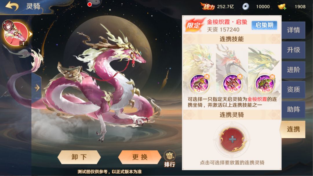 本次更新后,金梭织霞将开放灵骑连携功能,守护使可从九皋玄翎、金毛犼、山岳潜形中选择一个激活对应灵骑效果,大幅增强其战斗属性。