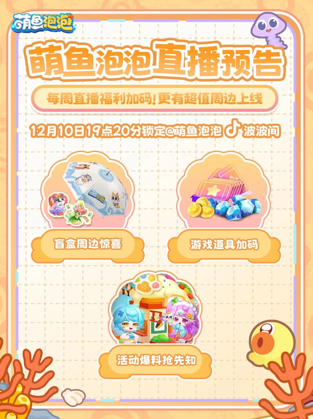 萌鱼泡泡抖音直播,惊喜启动!12月10日晚19:20分,等你相遇~