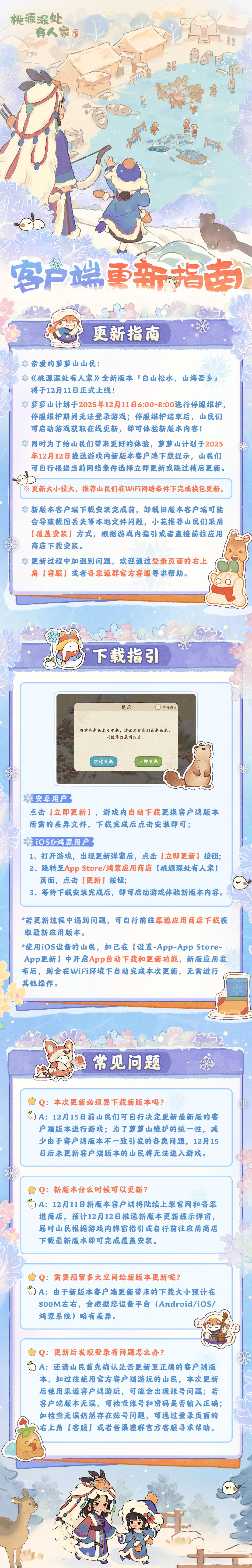 同时为了给山民们带来更好的体验,萝萝山计划于2025年12月12日推送游戏内新版本客户端下载提示,山民们可自行根据当前网络条件选择立即更新或跳过稍后更新。