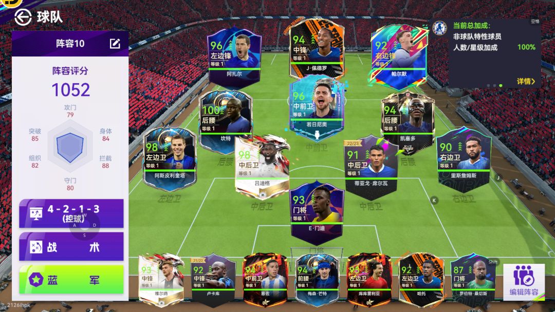 切尔西套:整个阵容最强的球员竟然是坎特。。。前锋一般般,中场防守强,但是进攻拉,后卫线左边卫还行,中卫弟媳不够看,里斯詹姆斯更是不够看,而且还有一堆老卡。。综合给到NPC
