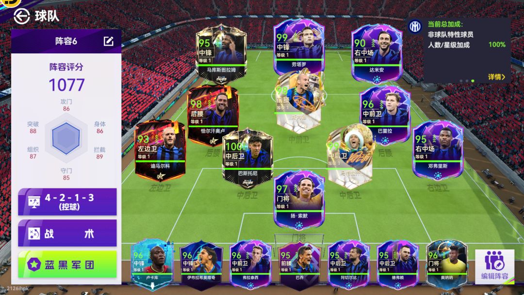 国米套:锋线还行能看的过去,中后场比较顶级,但是两个边有点攻强守弱,替补也一般般,只能给到人上人。