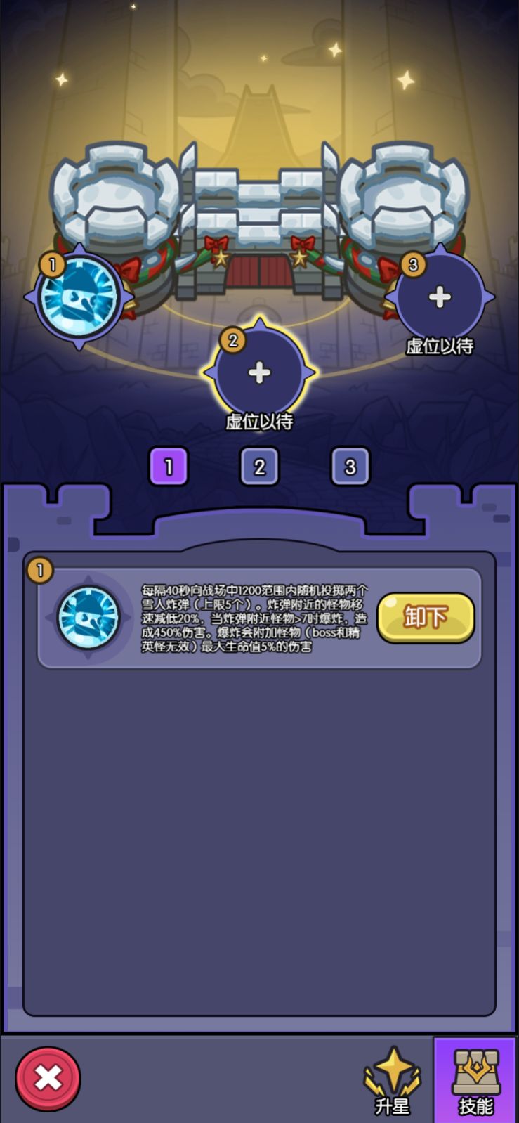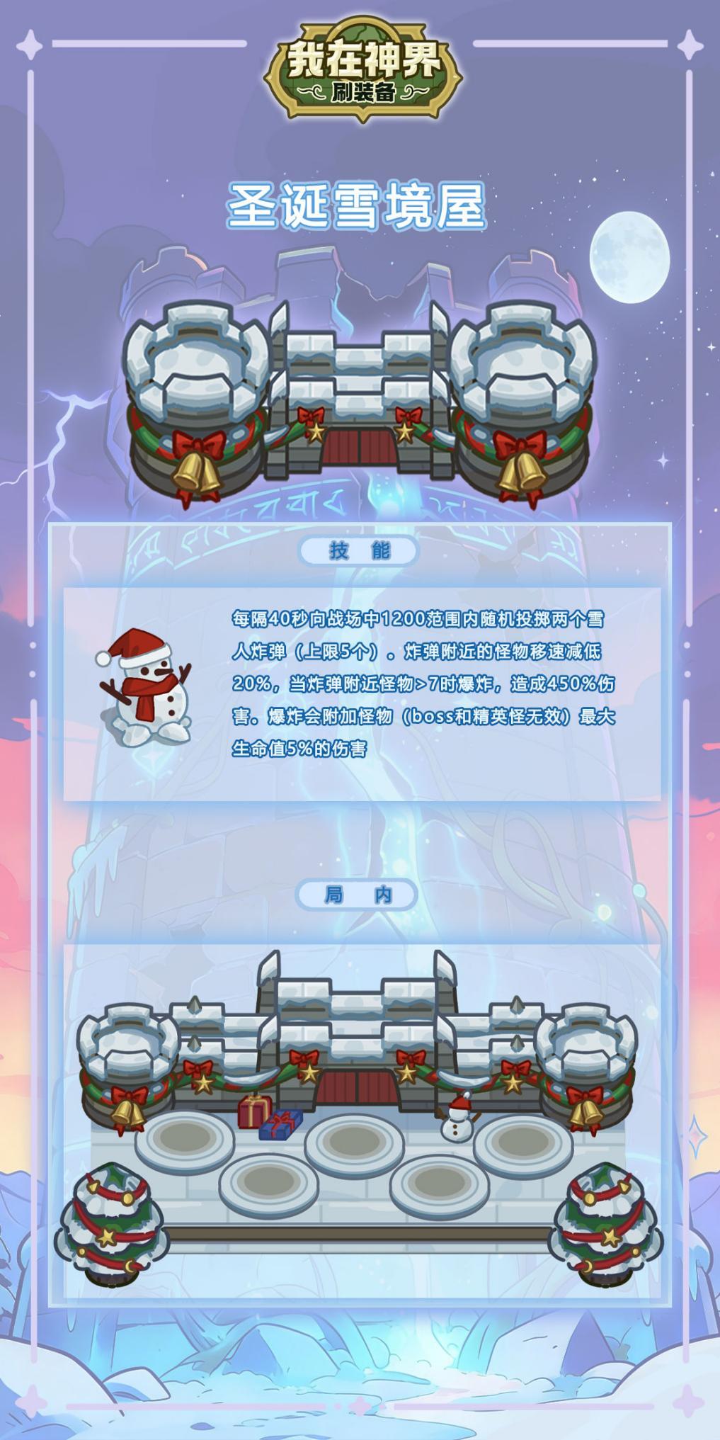 皮肤效果预览:每隔40秒向战场中1200范围内随机投掷两个雪人炸弹(上限5个)。炸弹附近的怪物移速减低20%,当炸弹附近怪物>7时爆炸,造成450%伤害。爆炸会附加怪物(boss和精英怪无效)最大生命值5%的伤害。