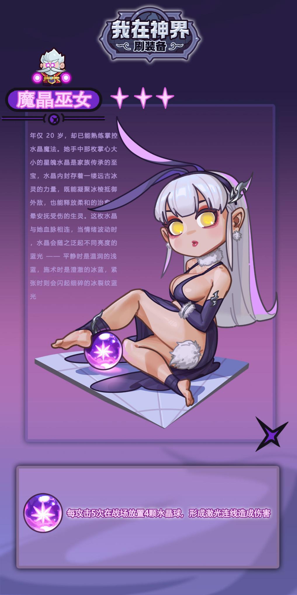 银白发丝挑染的冷艳紫光与她金黄的瞳眸,散发出不可直视的魅惑与权威。她慵懒地席地而坐,身姿被深紫丝绒半遮半掩,手中摩挲的魔晶球,是巫灵之力的永恒封存。她慵坐于阵纹之上,漫不经心抬眼的刹那,水晶已凝作冰棱。每攻势落下,水晶球便在战场迸裂,激光连织成网 —— 这哪是治愈的柔光,是裹着温柔表象的凛冽杀招。