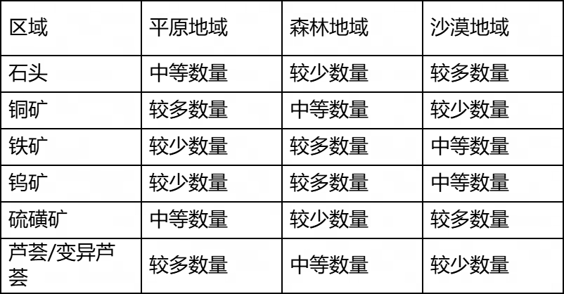 对禁区的整体矿物和植物分布进行了差异化调整,使其更符合地理环境特征,并形成鲜明的区域资源特色: